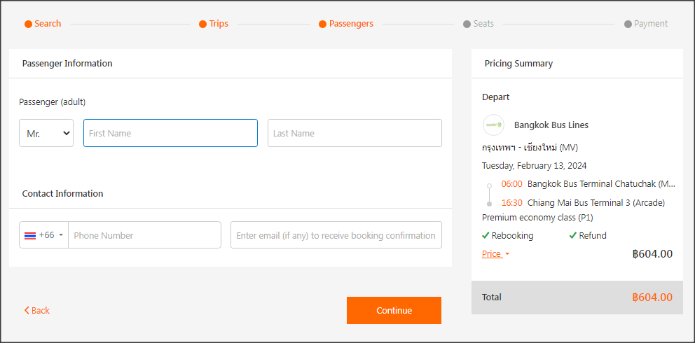 4.Fill in Passenger Information and Contact Information and Click “Continue” Button